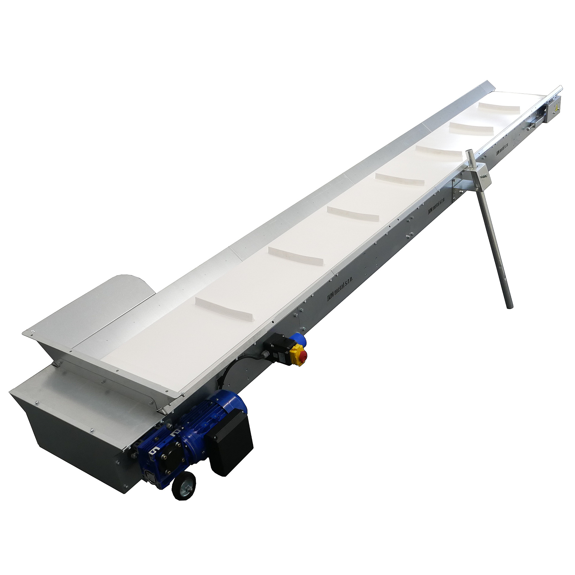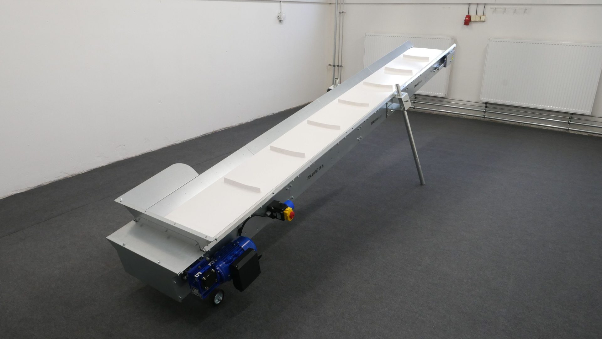 The cleated belt is suitable for transporting piece goods at an incline of up to 35 degrees